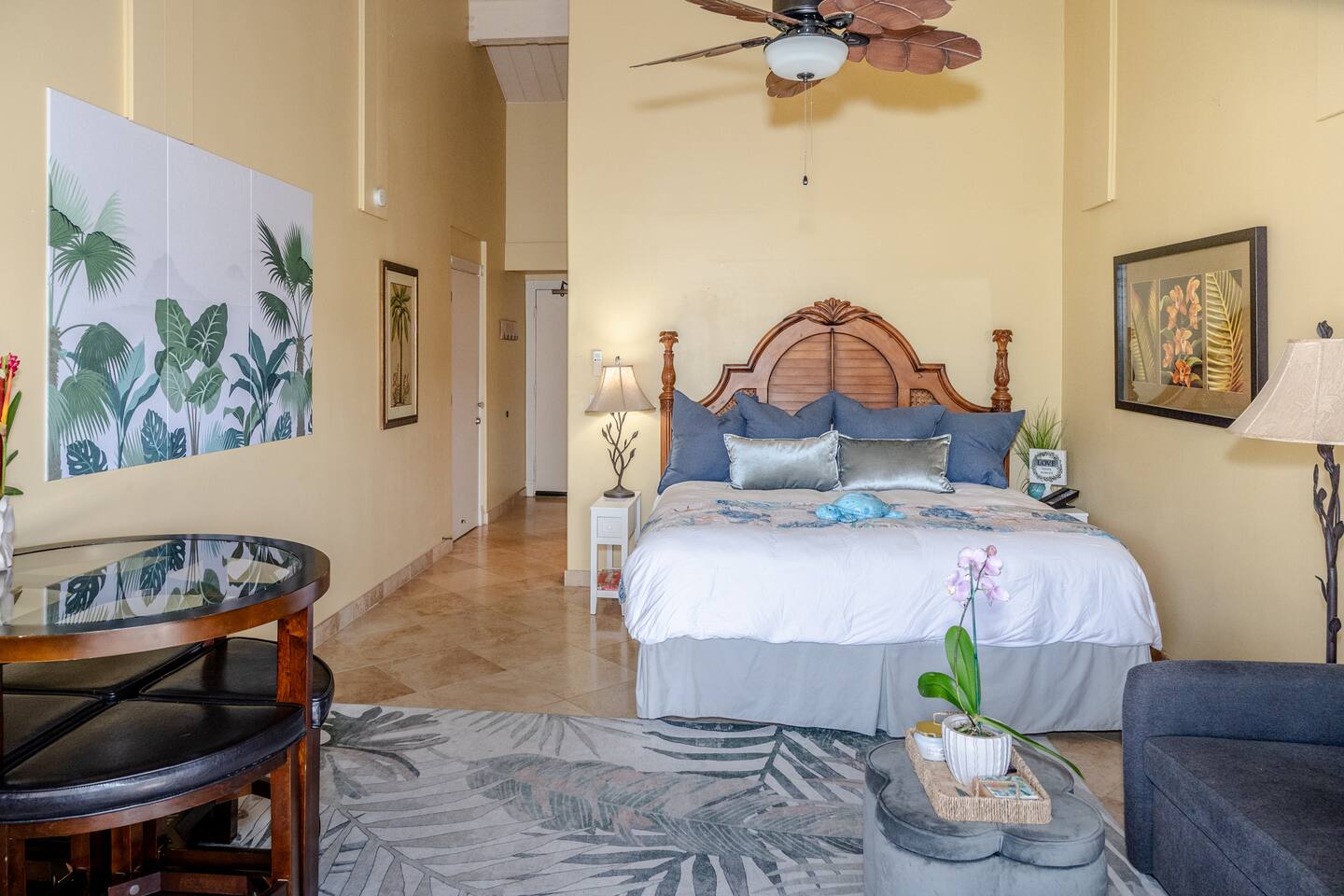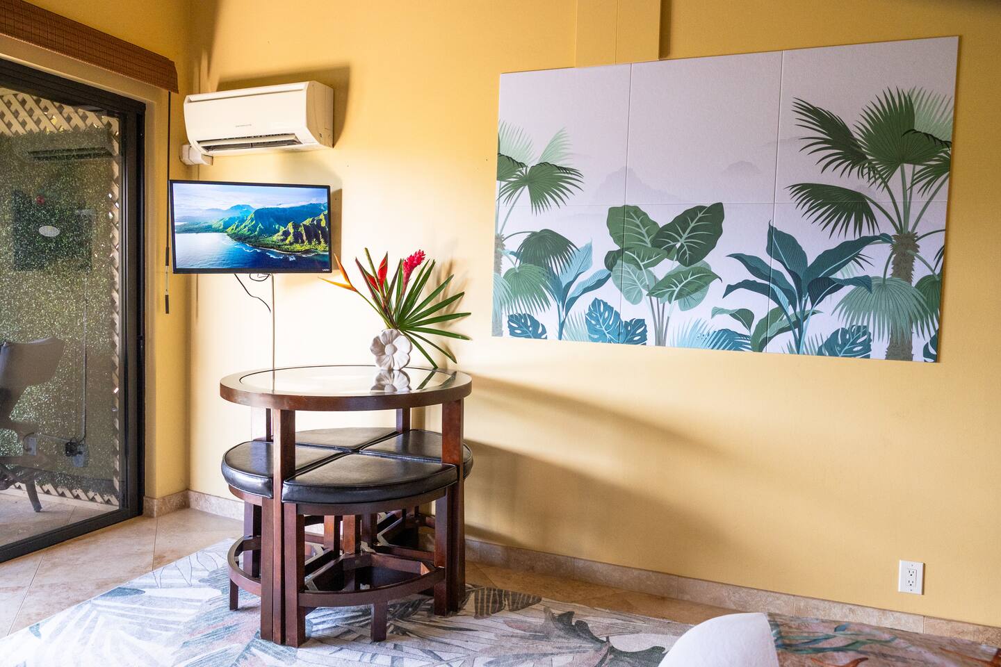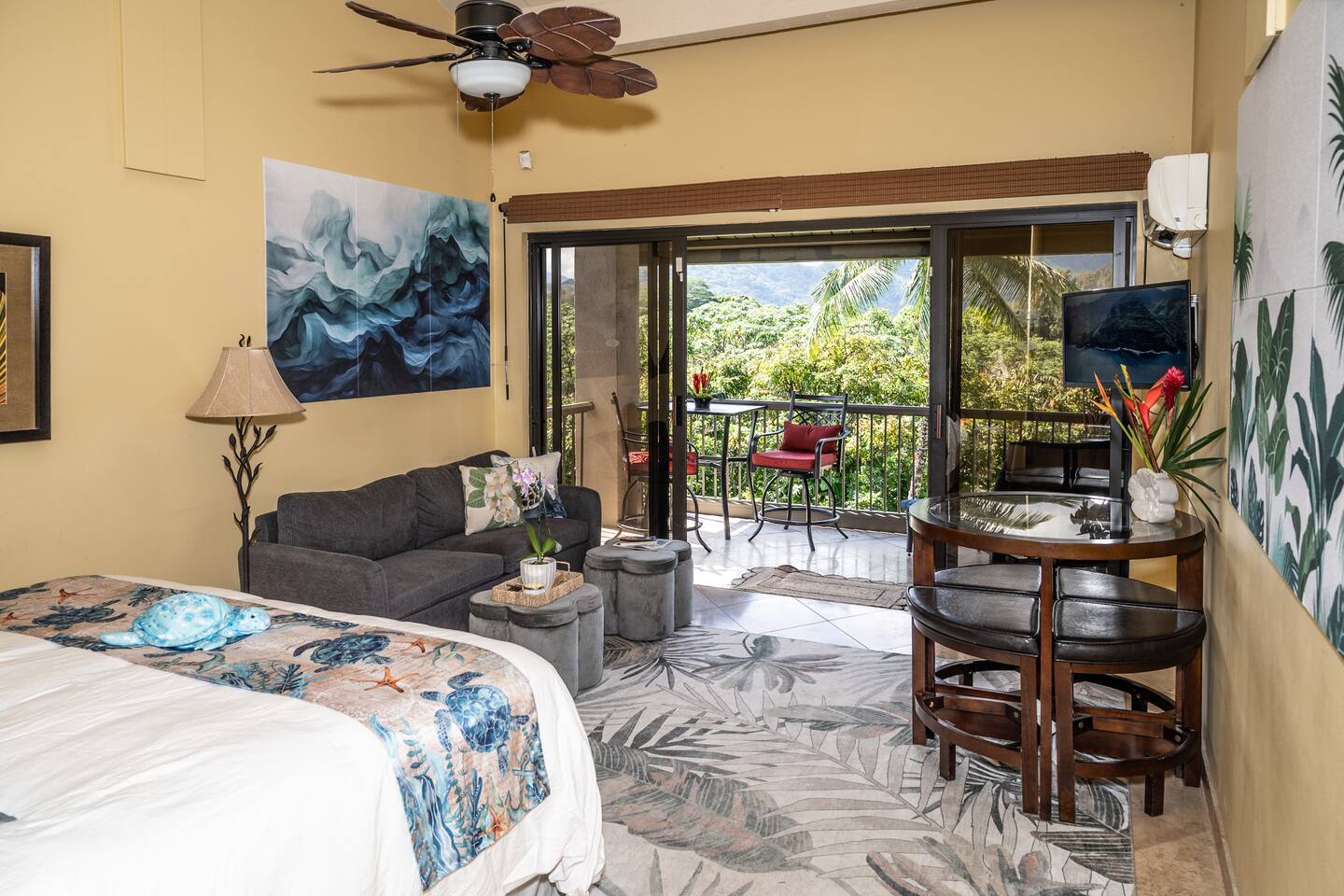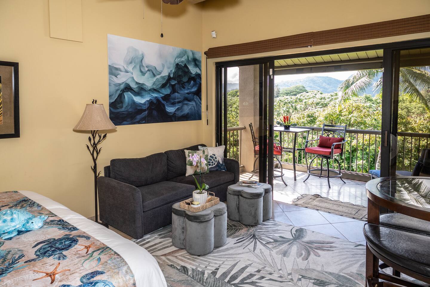 Unit 1537 is a cozy and inviting retreat, perfectly suited for a relaxing getaway. This spacious studio features a comfortable king-sized bed, a queen sized pull out couch, a fully equipped kitchenette, and a large bathroom with a walk-in shower. The room is also equipped with a large flat-screen TV and air conditioning for your comfort. **Amenities:** * Fully stocked kitchenette with essential appliances and utensils * Large bathroom with walk-in shower * King-sized bed for a restful night's sleep * Large flat-screen TV for entertainment * Air conditioning for a comfortable temperature * Beautiful views of the surrounding mountains * Large outdoor lanai for relaxation and taking in the scenery **Resort Amenities:** * Access to the resort pool and waterfall jacuzzi * Opportunities to enjoy the beautiful views and surroundings * Close proximity to other resort amenities and activities **Ideal for:** * Couples looking for a romantic getaway * Solo travelers seeking a relaxing retreat * Small families with young children** Business travelers requiring a comfortable and convenient stay **Additional Information:** We are delighted to have you stay with us and provide you with a comfortable and enjoyable experience. Please note that, in addition to the rates quoted, the resort charges a few extra fees to enhance your stay with us. Guests are responsible for: $50 - One-time CHECK-IN FEE plus local applicable taxes $25 - RESORT FEE plus applicable local taxes per day $20 - PARKING FEE plus applicable local taxes per day IF you have a vehicle *Please note that these fees are charged by the resort and are NOT included in the reservation total quoted *Resort fee includes but is not limited to - WIFI, use of all resort amenities such as, fitness center, business center, tennis and pickle ball courts, barbecue areas, daily events (SEE PHOTOS FOR DETAILS), resort pools and hot tub, shuttle service, Beach Access, Access to 1Hotel Restaurants. RESORT AMENITIES: -Two resort swimming pools (not heated) and a large hot tub -Tennis and Pickle Ball Courts and a professional tennis shop -Business Center -Fitness Center -Hospitality Lounge-Complimentary -Ocean-view fire pit with lounge area -Happy Talk Lounge with scenic Hanalei Bay views -Multiple community BBQ locations THINGS TO NOTE: This studio does NOT have a full kitchen, but rather a kitchenette. There is access to a full kitchen in the hospitality lounge (1 minute walk), BBQ areas, and coined laundry facilities. LATE DEPARTURE? Are you departing from Lihue later in the day and looking for a way to make the most of your remaining vacation time? Look no further! For just $25, you can extend your stay at our resort and enjoy the luxurious amenities we have to offer. Leave your luggage with our friendly staff and spend the day lounging by the pool, playing a game of tennis, or soaking up the sun on our beautiful beach. Take a leisurely stroll around the grounds, enjoying the lush tropical surroundings and tranquil atmosphere. When it's time to head to the airport, simply take a refreshing shower in our modern shower facilities and get ready for your departure. You'll feel revitalized and relaxed, making the most of your last day on the island. * $25 per person (includes access to all resort amenities) * Leave your luggage with our staff and enjoy the day without worrying about your belongings * Shower facilities available for use before departing for the airport * Package available for all guests departing from Lihue later in the day Upon Check-out, just inform the front desk and they can accommodate your request.